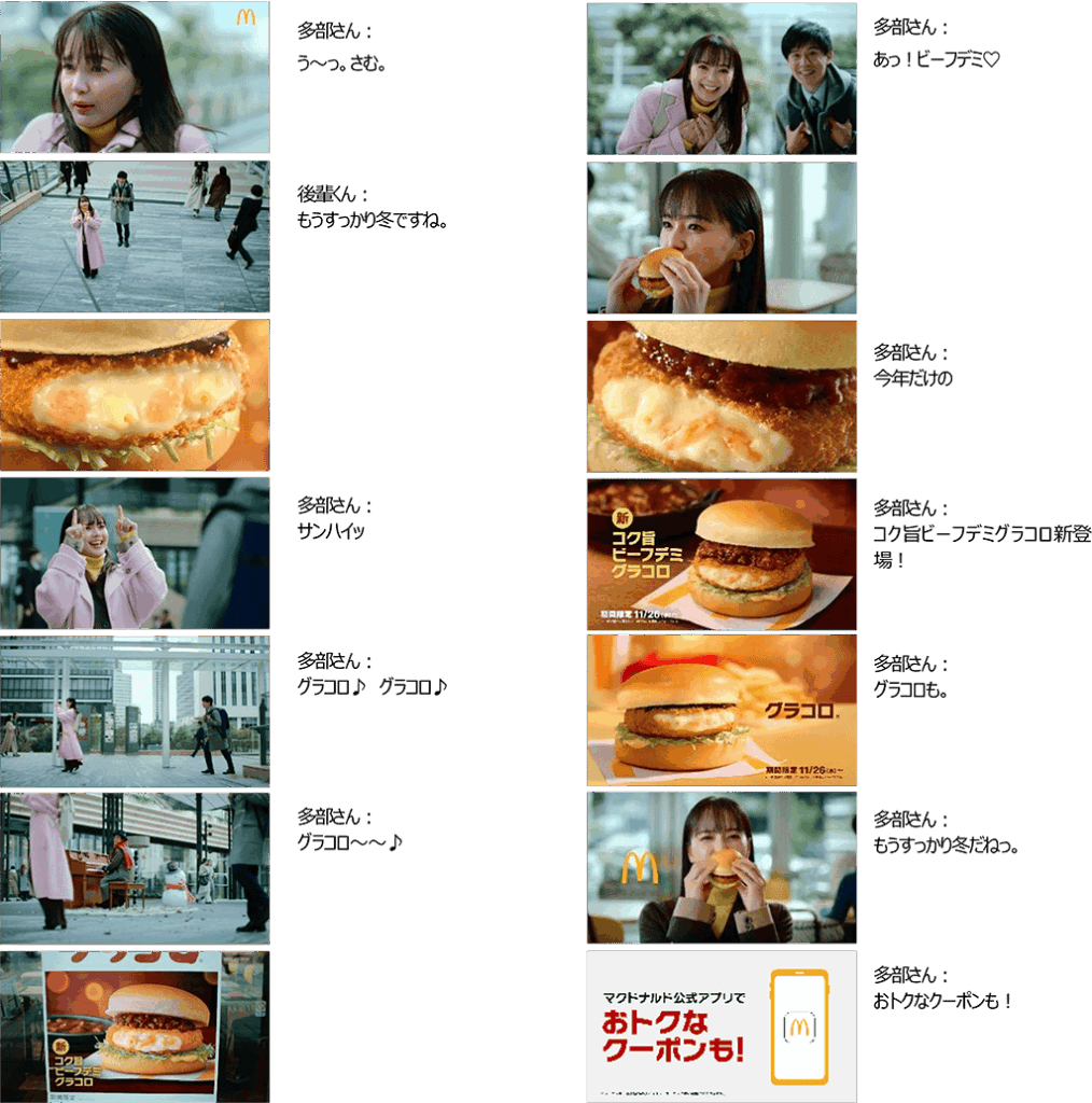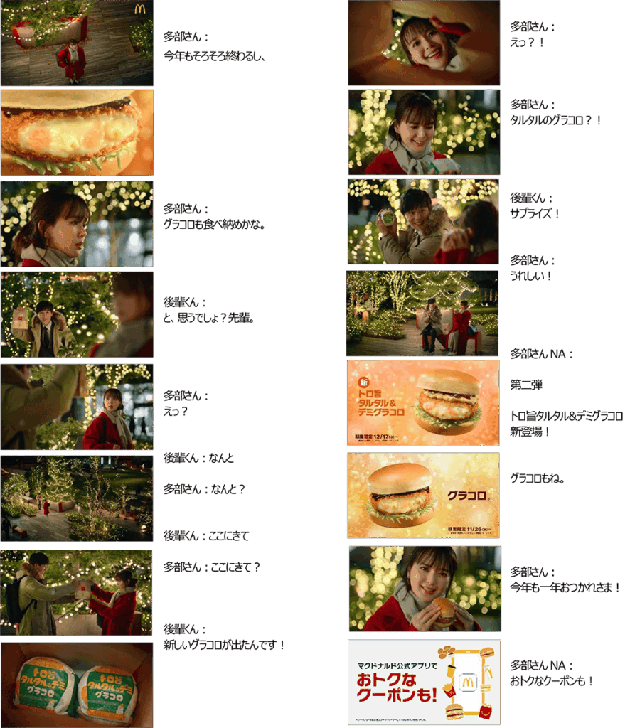 外気の寒さから冬の訪れを感じた多部が、待望の「グラコロ」の季節がやってきたことを連想し、思わずワクワクを掻き立てるキャッチーなグラコロソングを口ずさむ姿が描かれています。